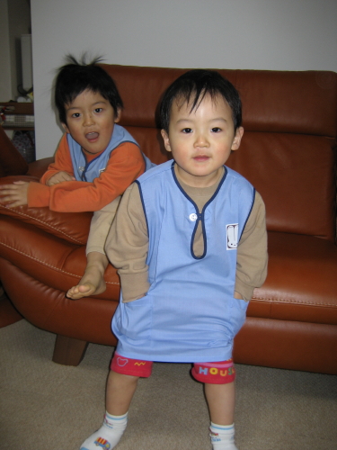 お兄ちゃんと二人でおそろいのスモックを着て毎日、これから出勤です!